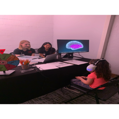 On 3/24/2024 (Sunday), Wang and NL3 Lab team members (Kelly [left] and Joanne [right] in the first photo) set up a station for the outreach event “BrainStorm 2.0” at the University of Nebraska Museum (Morrill Hall). In the first photo, Kelly and Joanne used a portable device called Kuduwave Pro to examine a young child’s pure tone threshold at different frequency bands. We had many families stop by our station and learn about the science of hearing.